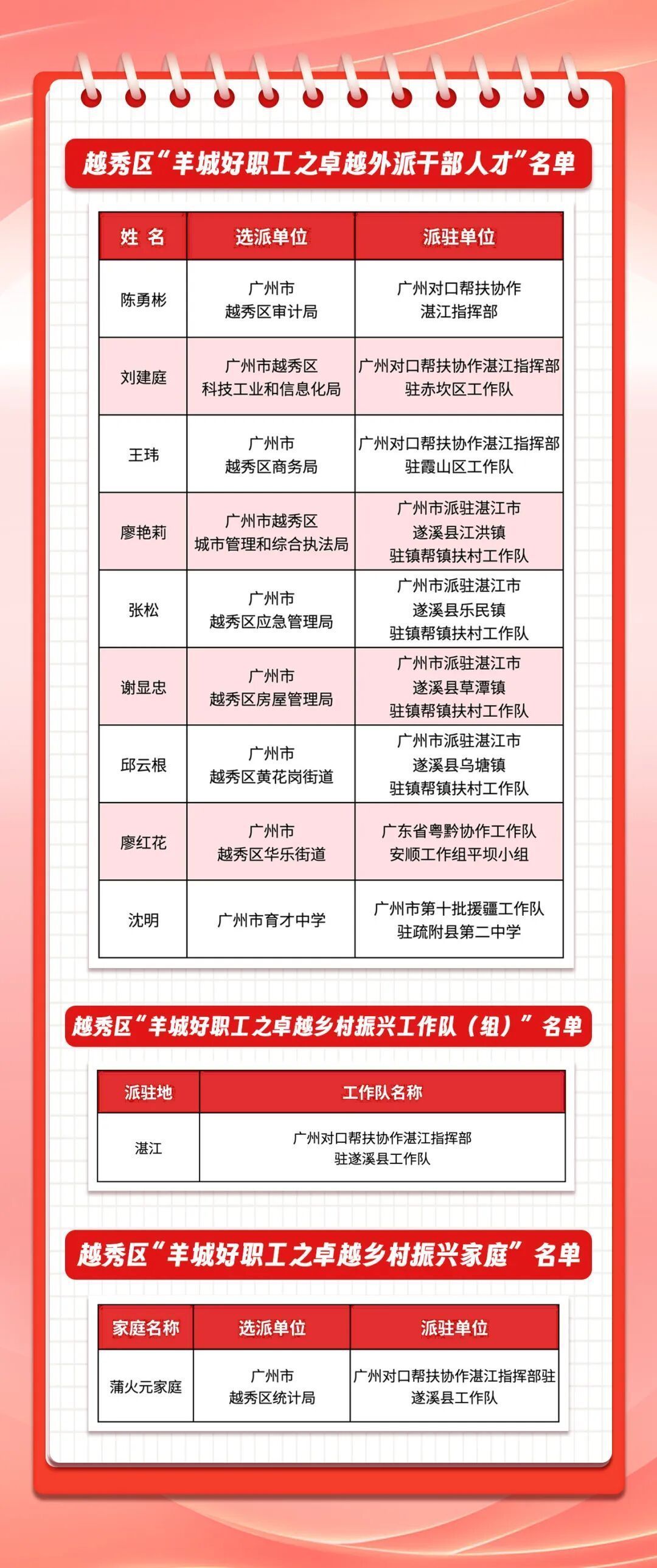 日前,在广州市总工会、共青团广州市委员会、广州市妇女联合会联合开展的2025年度寻找“卓越”系列关爱外派干部人才活动中,越秀区9名职工获评“羊城好职工之卓越外派干部人才”,1个工作队获评“羊城好职工之卓越乡村工作队(组)”,1个职工家庭获评“羊城好职工之卓越乡村振兴家庭”。他们肩负使命,脚踏实地,用奉献诠释初心,用实干诠释担当,是乡村振兴路上的最耀眼的榜样。
